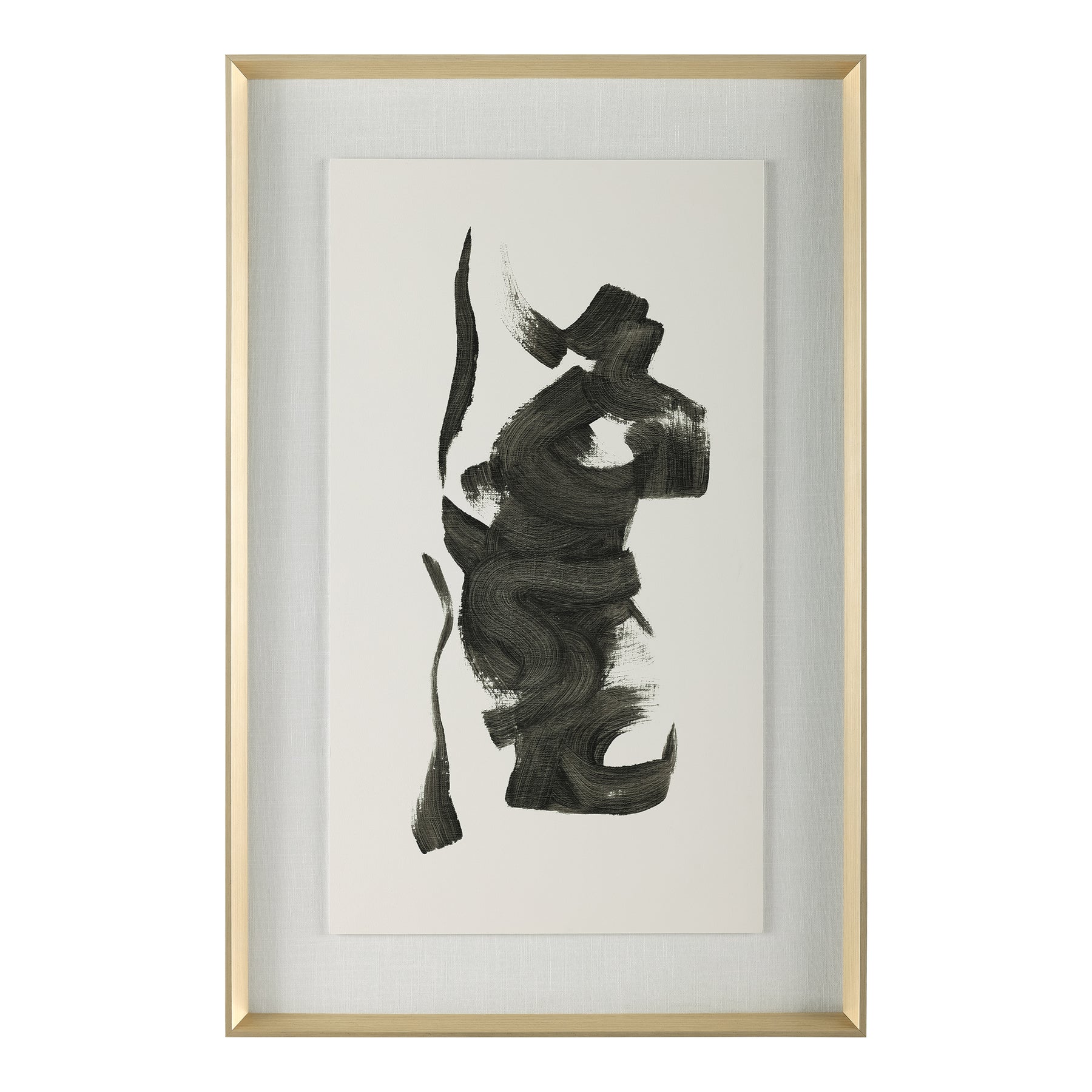 Torso I by Maja Gunnarsdottir is an abstract print on watercolor paper, mounted against a crisp white linen background. Bold, expressive brushstrokes paired with delicate flourishes in deep black create a compelling composition that commands attention and infuses spaces with dynamic movement. Framed in champagne wedge gallery styling, this vertical-display piece brings artistic sophistication and contemplative elegance to refined interiors.