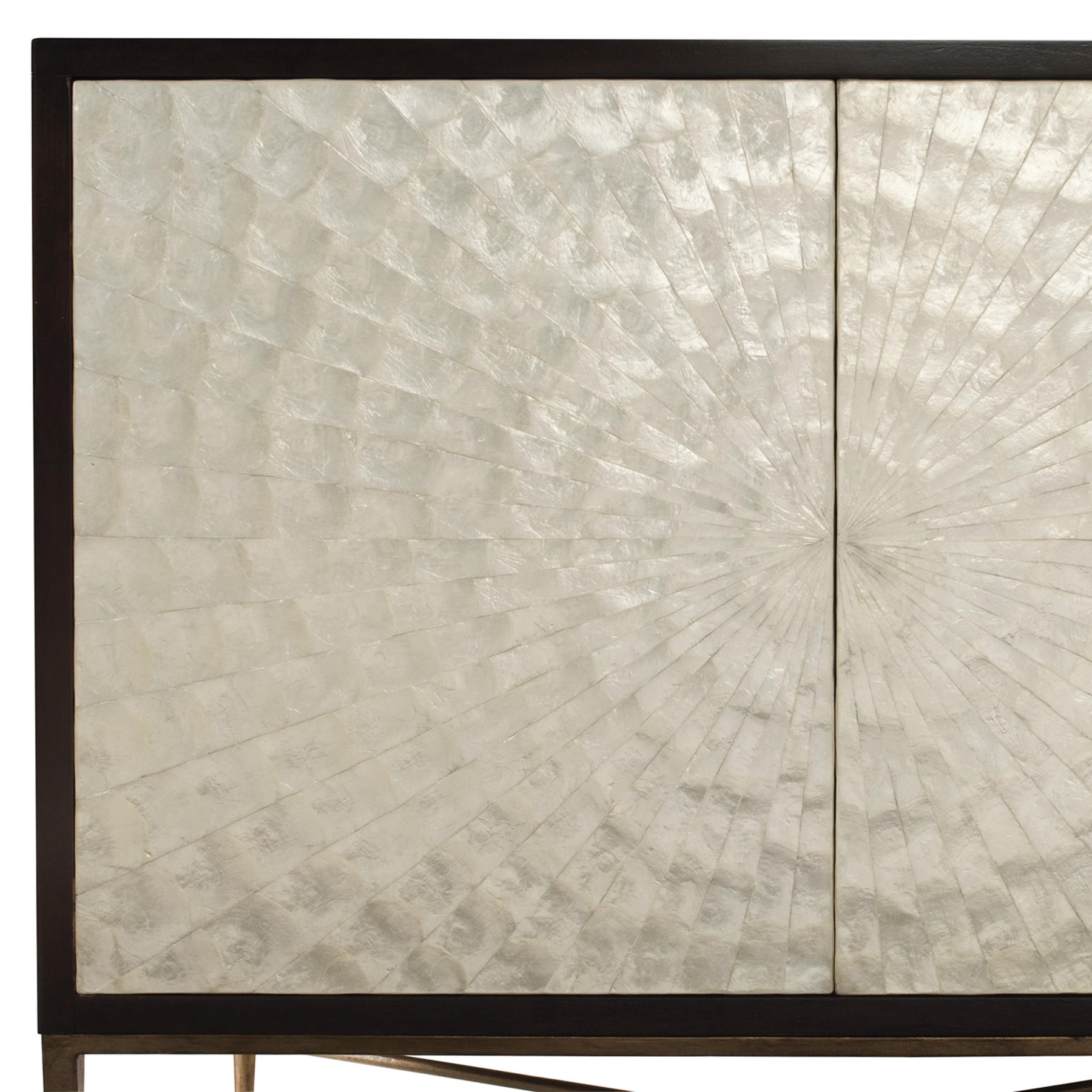 Adarion Buffet showcases refined craftsmanship with solid gmelina construction in a warm Espresso finish. Capiz shell door fronts deliver understated elegance, while the bronze-finished tubular steel base and "X"-shaped stretchers add architectural interest. Hardware-free design keeps the focus on natural materials and clean lines. Inside, adjustable removable shelves and three generous drawers provide flexible storage for dining essentials, making this piece as practical as it is visually striking.
