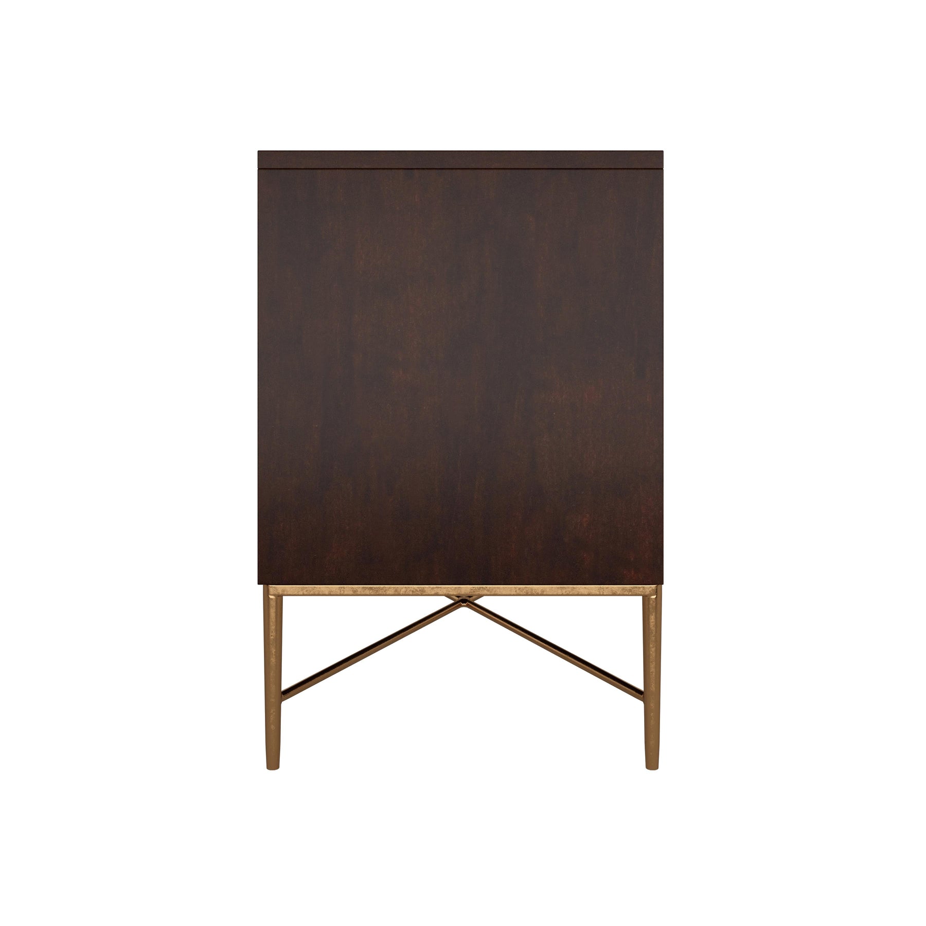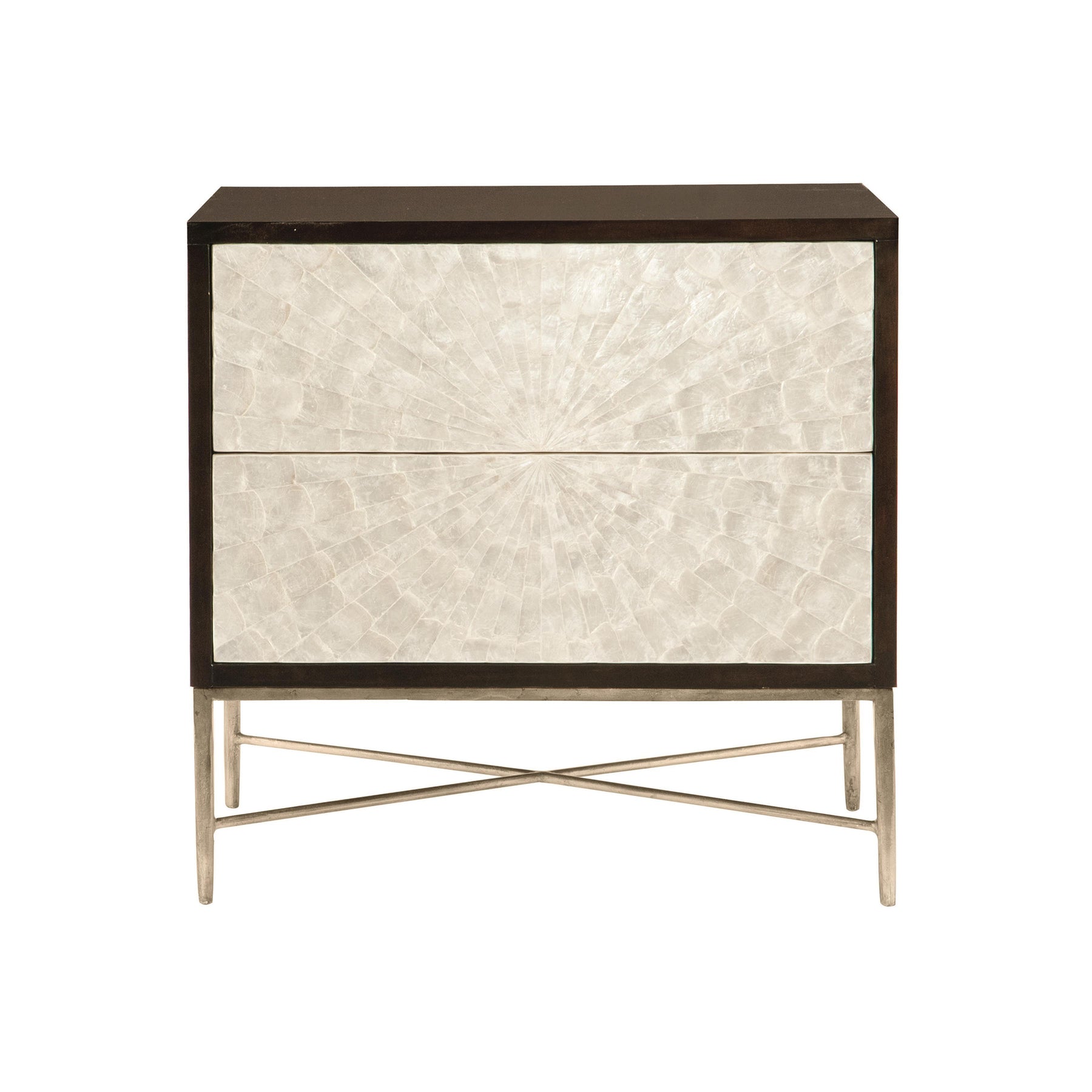The Adarion Nightstand combines refined craftsmanship with contemporary elegance. Constructed from solid Gmelina wood and flat-cut cherry veneers in a rich espresso finish, this piece features two generously proportioned drawers showcasing stunning Cadiz shell fronts that serve as the focal point. The streamlined silhouette maintains a minimalist aesthetic, allowing the shell-adorned drawer fronts to command attention. A distinctive tubular steel X-base in bronze finish grounds the design with industrial sophistication, creating a striking contrast that elevates any bedroom setting.