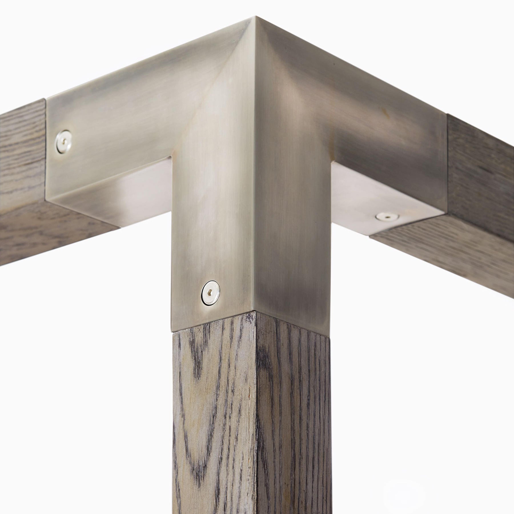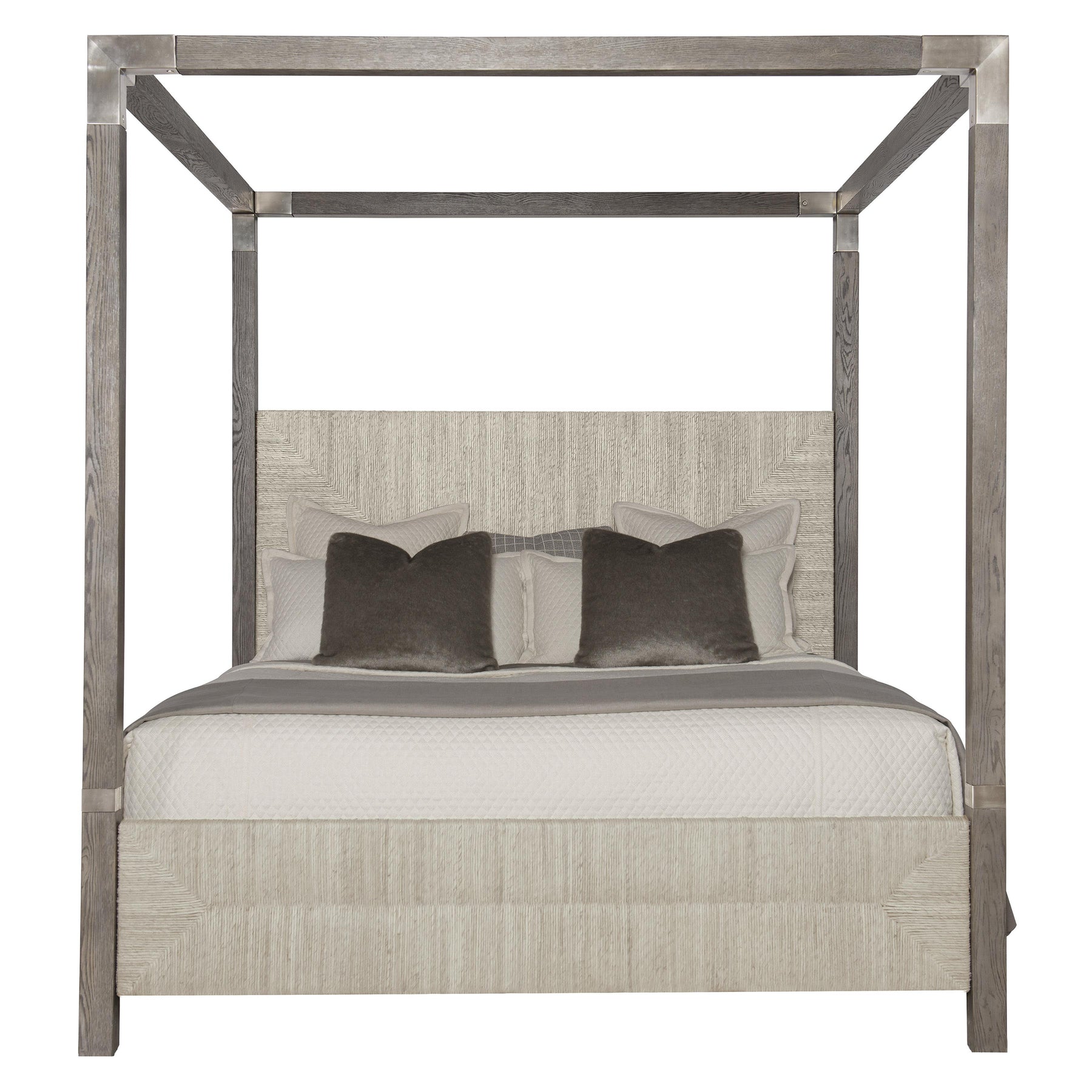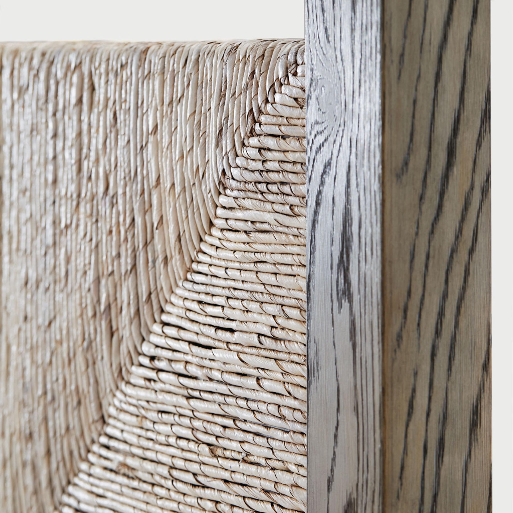 The Paula Canopy King Bed merges coastal elegance with artisanal craftsmanship. Organic abaca weaving in a striking geometric pattern adorns the headboard and footboard, while solid oak construction with flat-cut white oak veneers creates a refined rustic aesthetic. Exposed wood side and top rails and a sophisticated grey finish complemented by stainless steel hardware complete this statement piece, bringing natural warmth and understated luxury to any bedroom sanctuary.