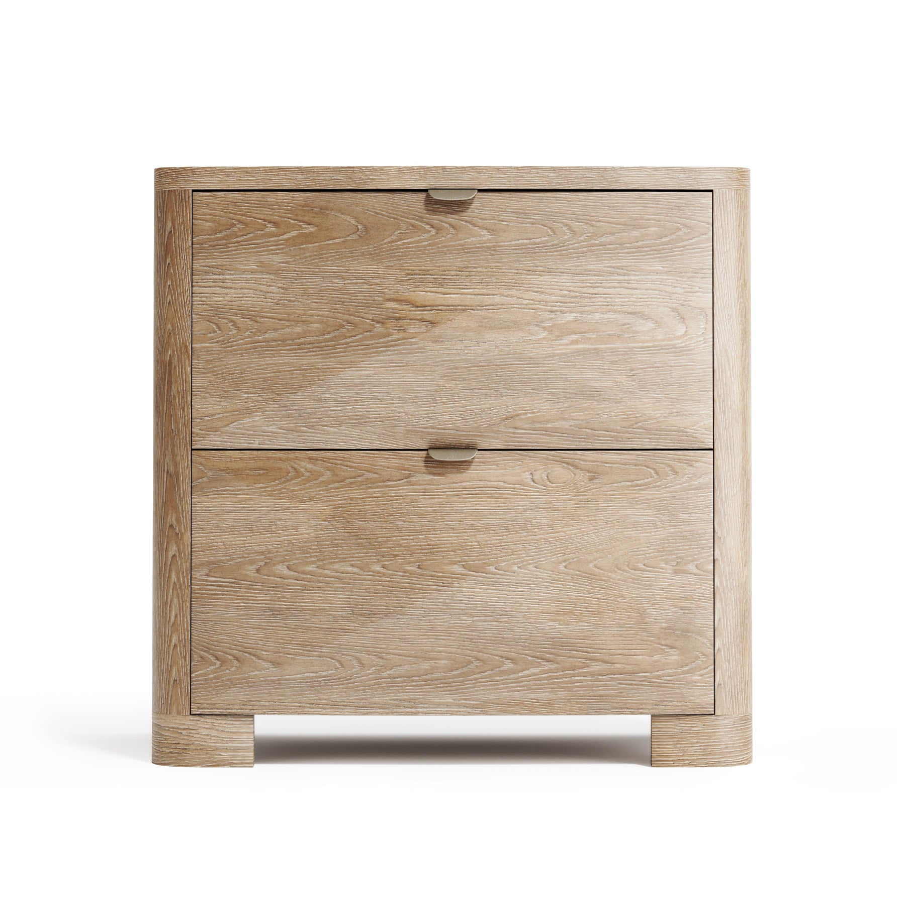 The Avenra Small Nightstand combines refined craftsmanship with modern convenience. Its dimensional pyramid-shaped drawers and elegant bow front design create visual interest, while white oak solids and veneers in a warm Marcona finish deliver timeless appeal. Frosted nickel tab pulls add a contemporary touch, and dual USB ports on the back keep your devices charged within arm's reach—perfect for the modern bedroom.