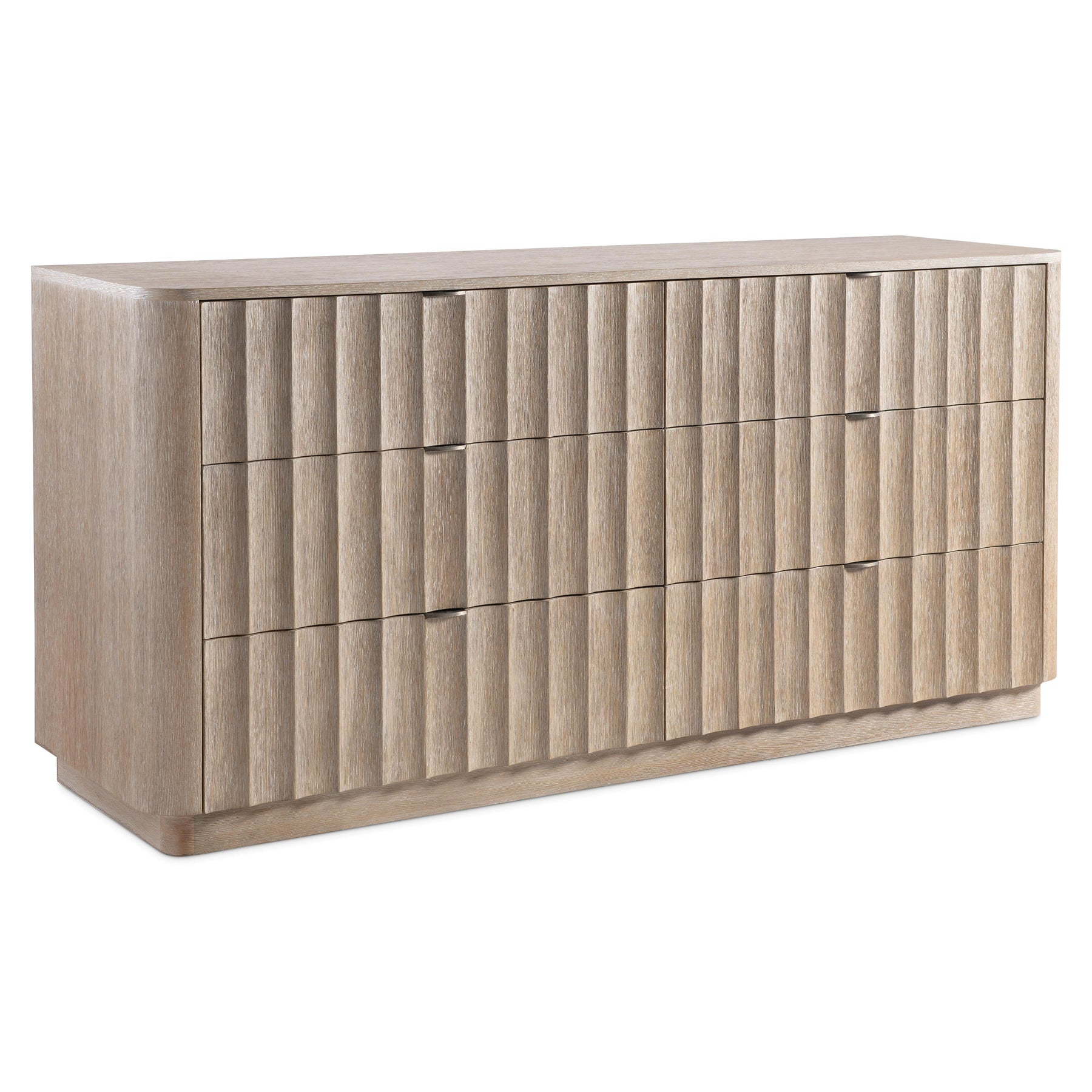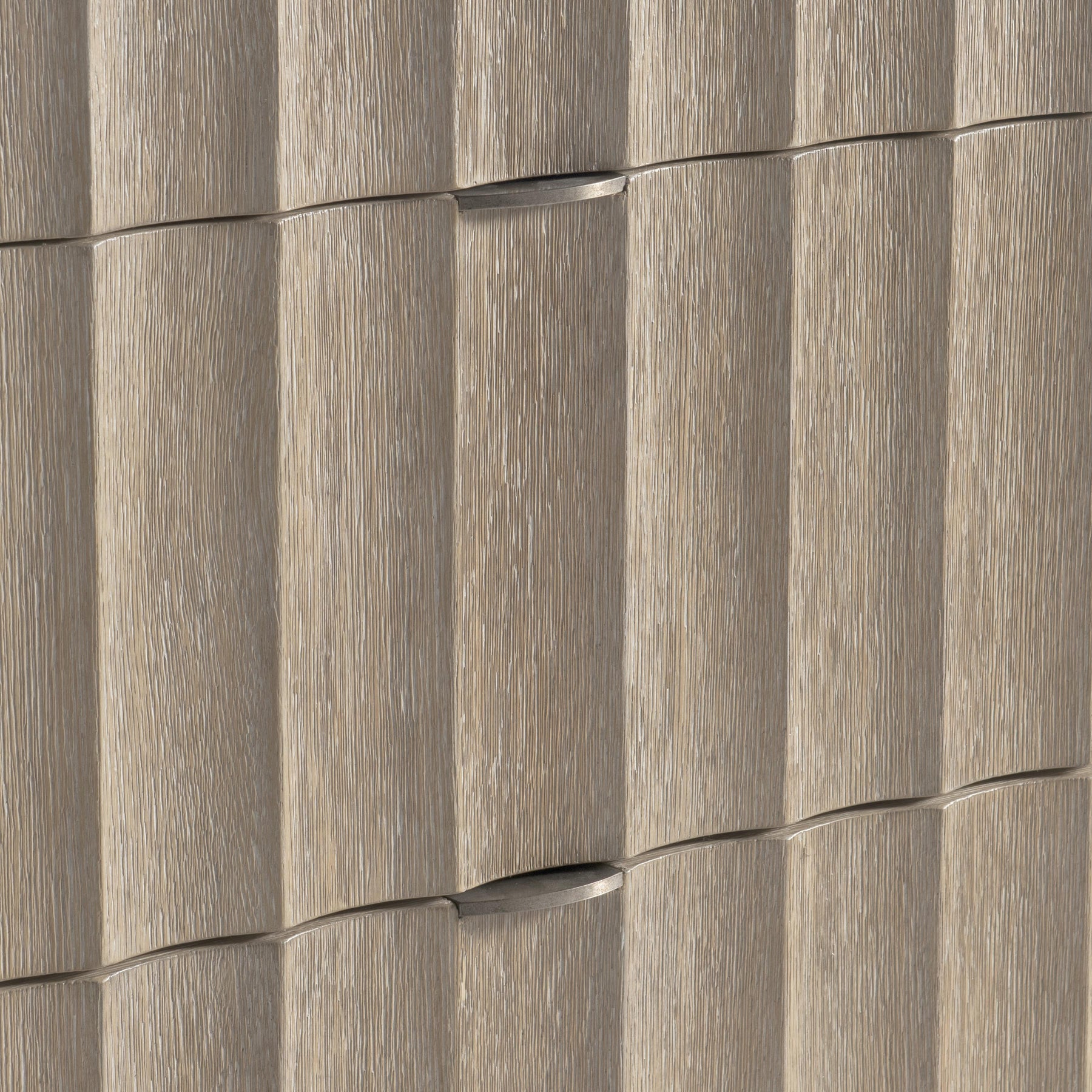 The Lojia Dresser combines refined craftsmanship with modern functionality. Its fluted drawer fronts create striking visual depth, while the elegant plinth base anchors the piece with architectural presence. The wood top features softly rounded corners in a sophisticated wire-brushed Aria finish, complemented by sleek stainless steel pull tabs in Laurion finish, seamlessly blending timeless design with contemporary convenience.