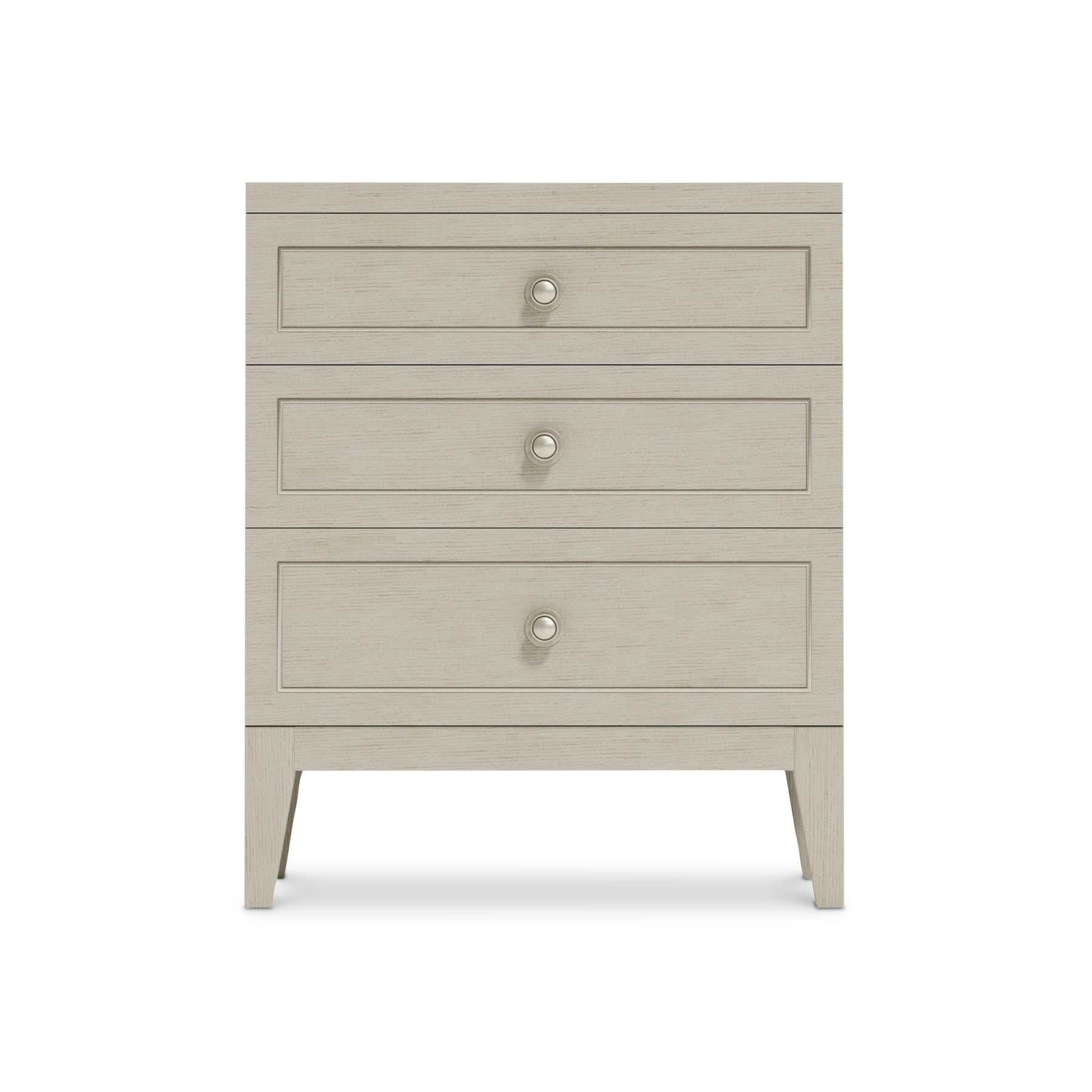 The Corlienne small Nightstand seamlessly blends timeless design with contemporary functionality. Crafted from Ash Wood in a soft Nebbia finish, this piece brings understated elegance to any bedroom. Brushed stainless steel metal inlays frame three drawers, while glazed stainless steel pulls add refined detail. Two USB ports integrated into the back keep devices charged within arm's reach, marrying classic craftsmanship with modern convenience.