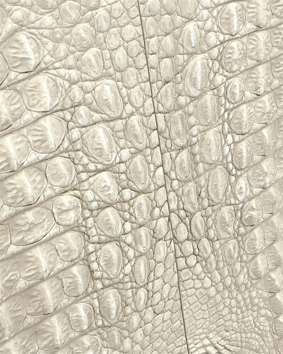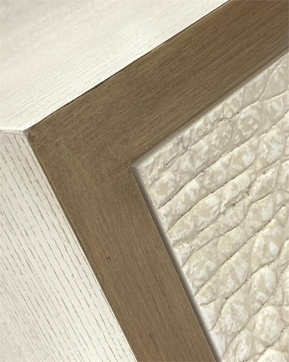 The Keno Two Door Chest commands attention with its striking book-matched faux crocodile doors in variegated cream and white, set against a rich antique beluga case. Brushed brass accents frame the molding and base, creating an unexpected interplay of texture and refinement. This is not a piece that blends in—it's a bold statement for the discerning collector who refuses conventional design.