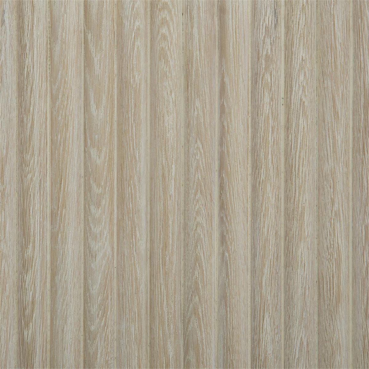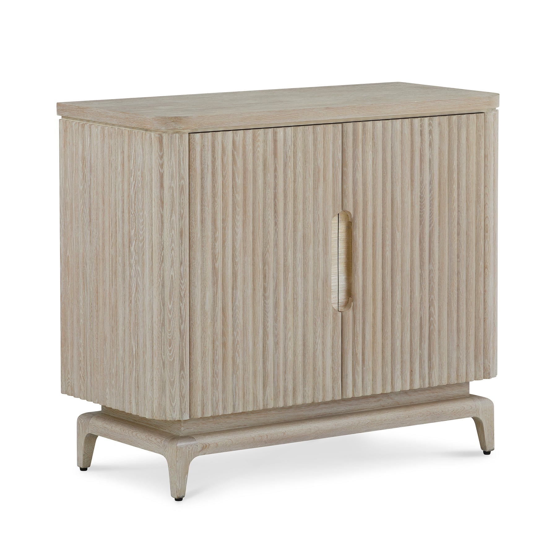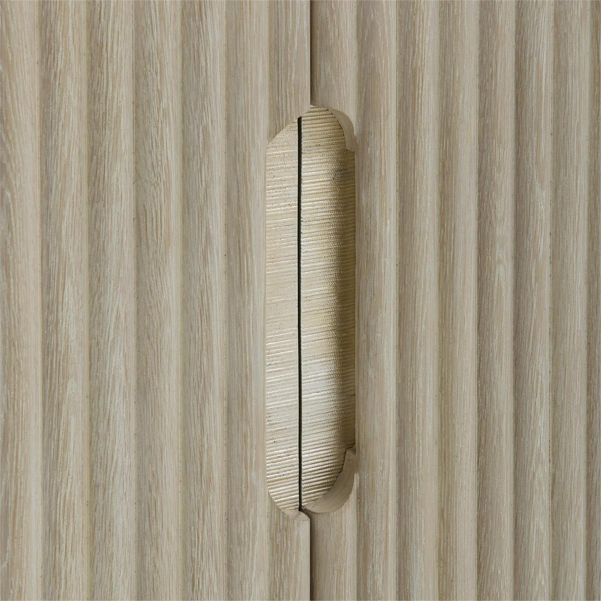 Ocean Breeze Two Door Chest marries refined aesthetics with understated charm. This two-door chest showcases white-washed oak wood, its fluted detailing along the sides and doors creating subtle visual rhythm. Inside the groove handles discover a sophisticated striped pattern finished in silver leaf—a delightful surprise that elevates everyday storage. Graceful curved lines soften the silhouette, while slender legs complete this elegantly playful piece. Perfect for adding quiet luxury to any room.