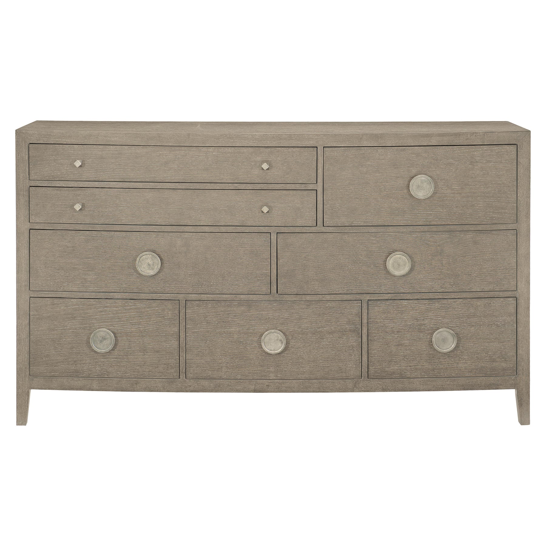 The Lidia Dresser brings refined restraint to your bedroom with its distinctive bow front silhouette and thoughtfully composed drawer arrangement. Wire-brushed oak veneers in a coursed greige finish create subtle visual depth, while cast aluminum hardware adds an understated industrial accent. This rustic modern piece balances artistic character with functional elegance, offering ample storage. A sophisticated choice for those who appreciate design that whispers rather than shouts.