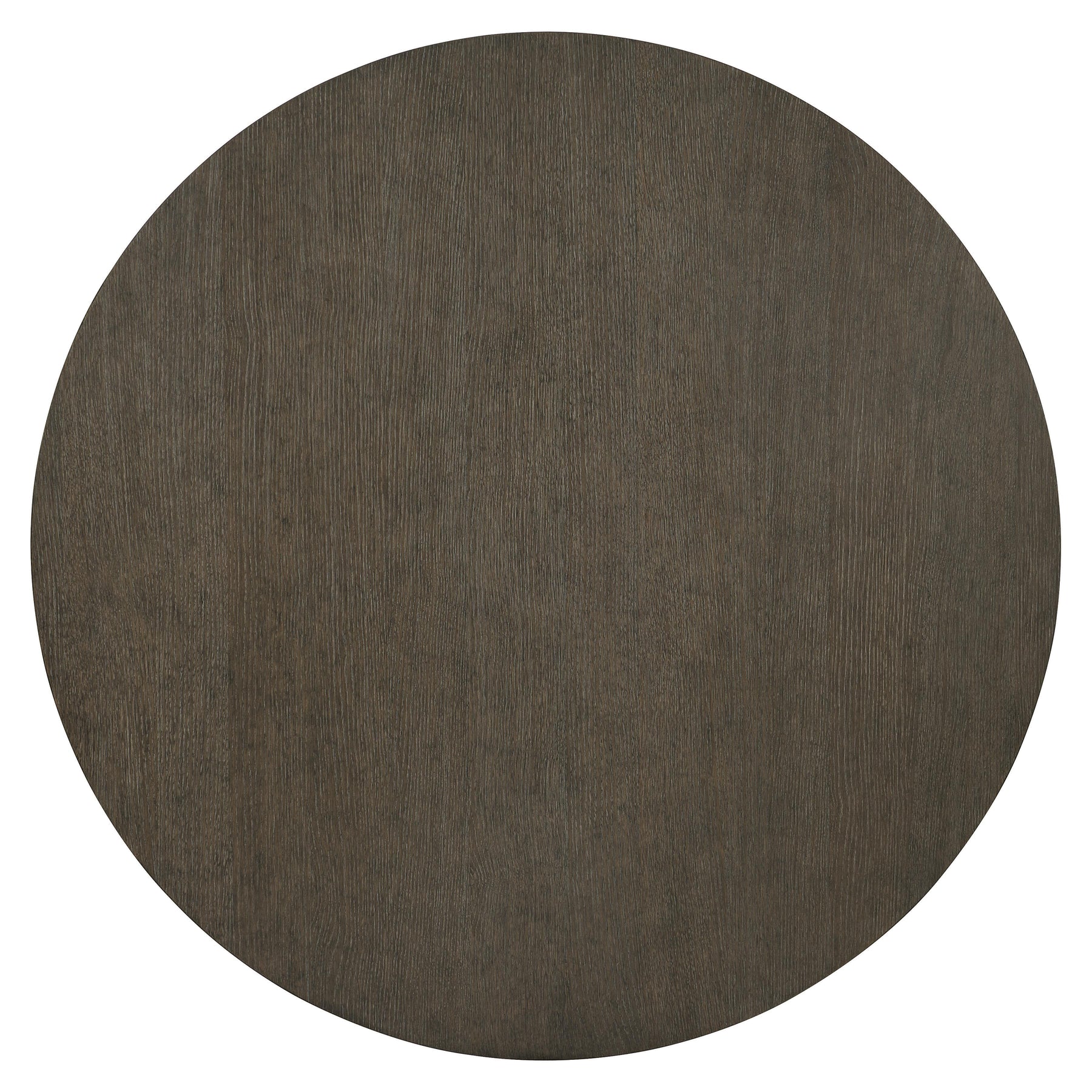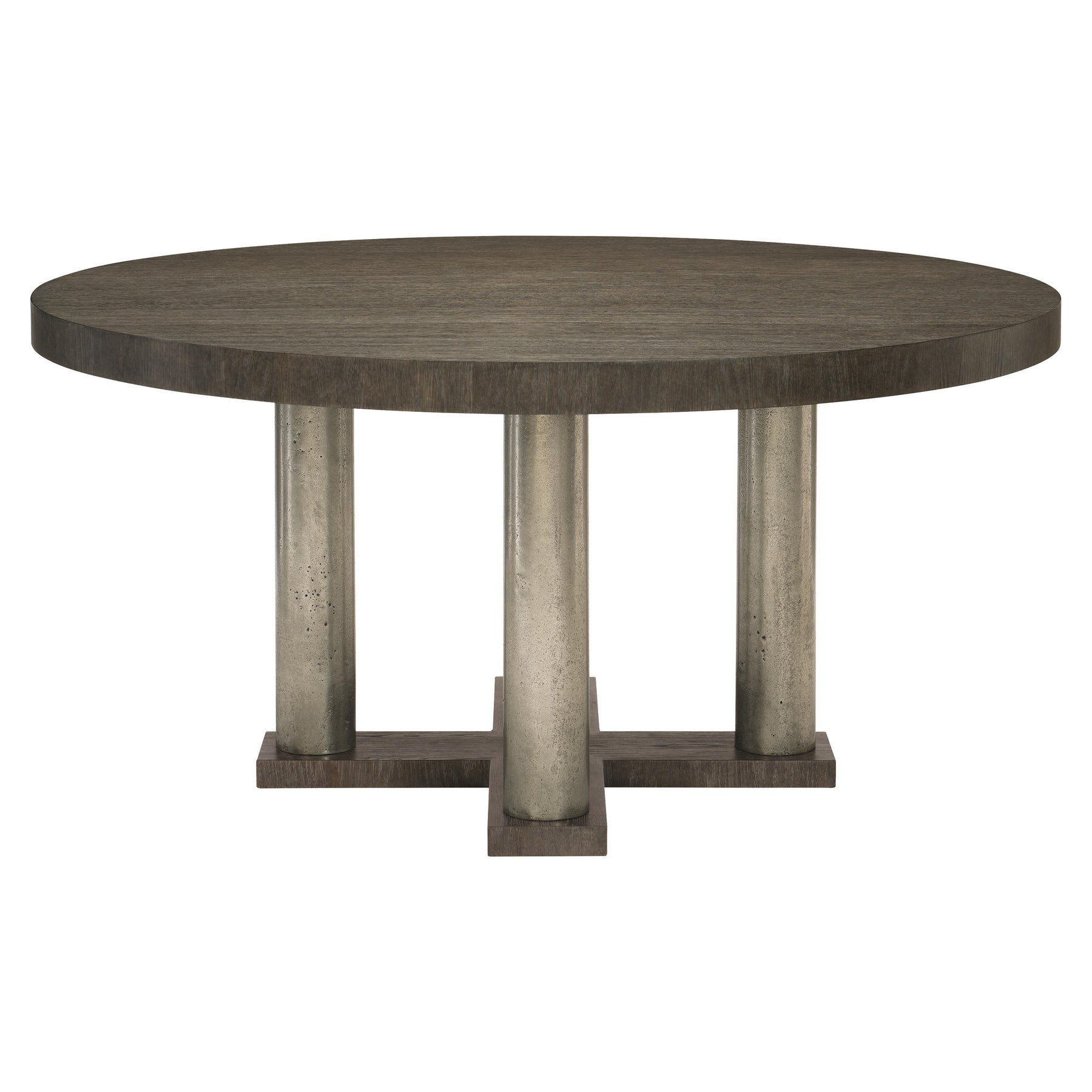 The Lidia Round Dining Table showcases sophisticated craftsmanship with wire-brushed oak veneers finished in a cerused charcoal finish sable texture that highlights subtle white hang-ups in the grain. Its transitional design is enhanced by aluminum posts in a textured graphite finish, adding modern detail. This table offers both style and versatility for your dining space.
