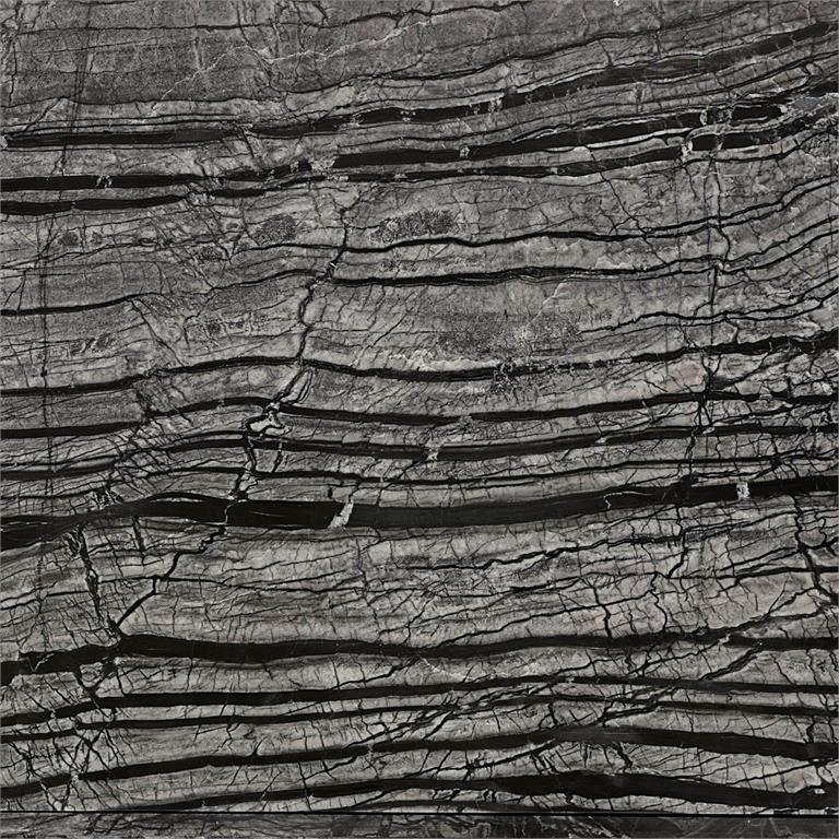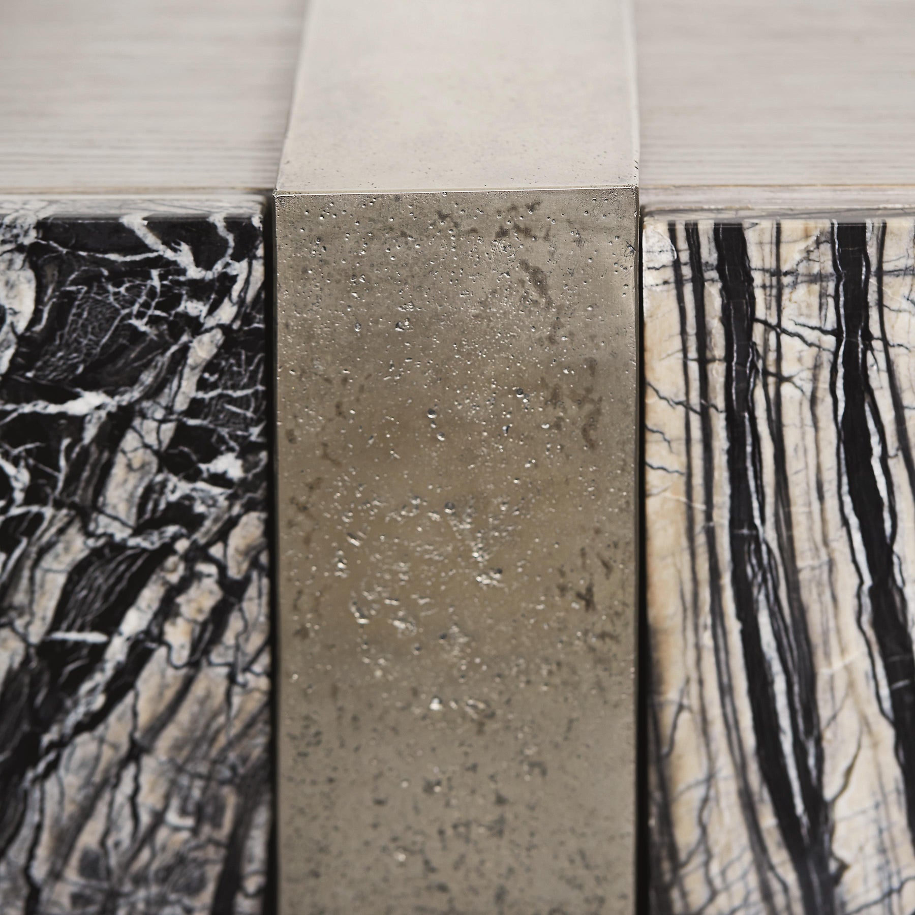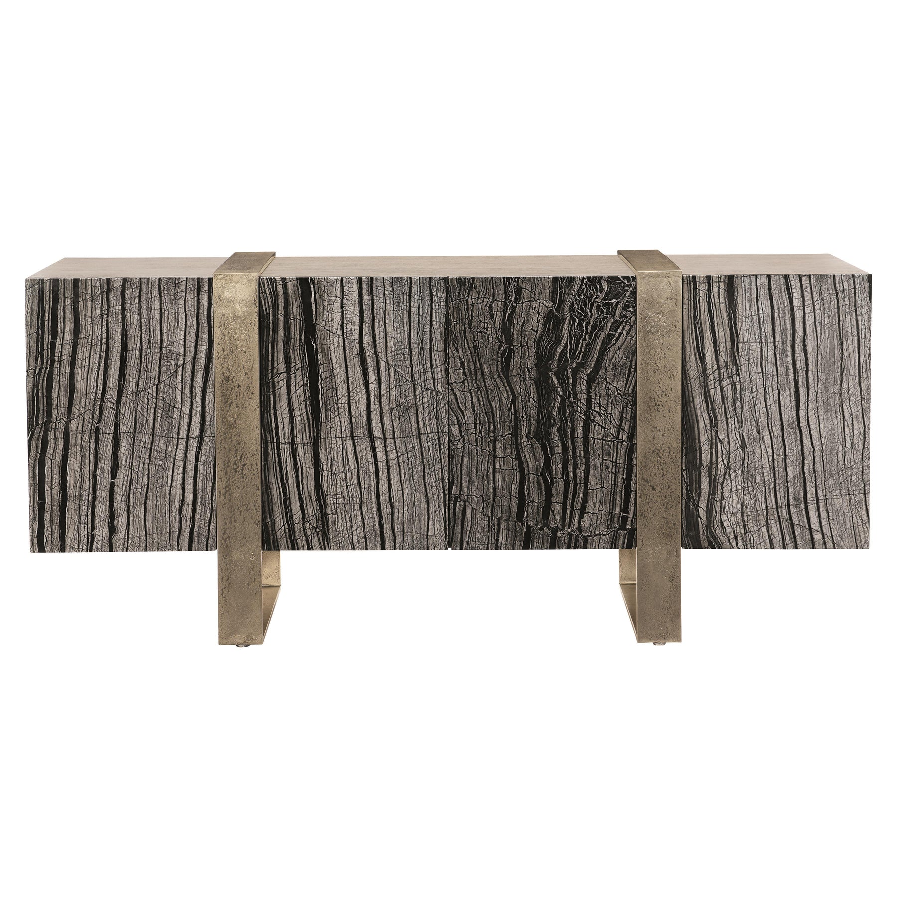 The Lidia Entertainment Credenza commands attention through bold material contrast. Black Forest marble with dramatic charcoal tones and crisp white striations forms the striking facade, while a textured cast aluminum frame wraps the entire case for architectural definition. Four push-to-open, self-closing doors operate seamlessly, concealing storage behind a statement-making exterior. This piece elevates any entertainment space with high-impact design and refined functionality.