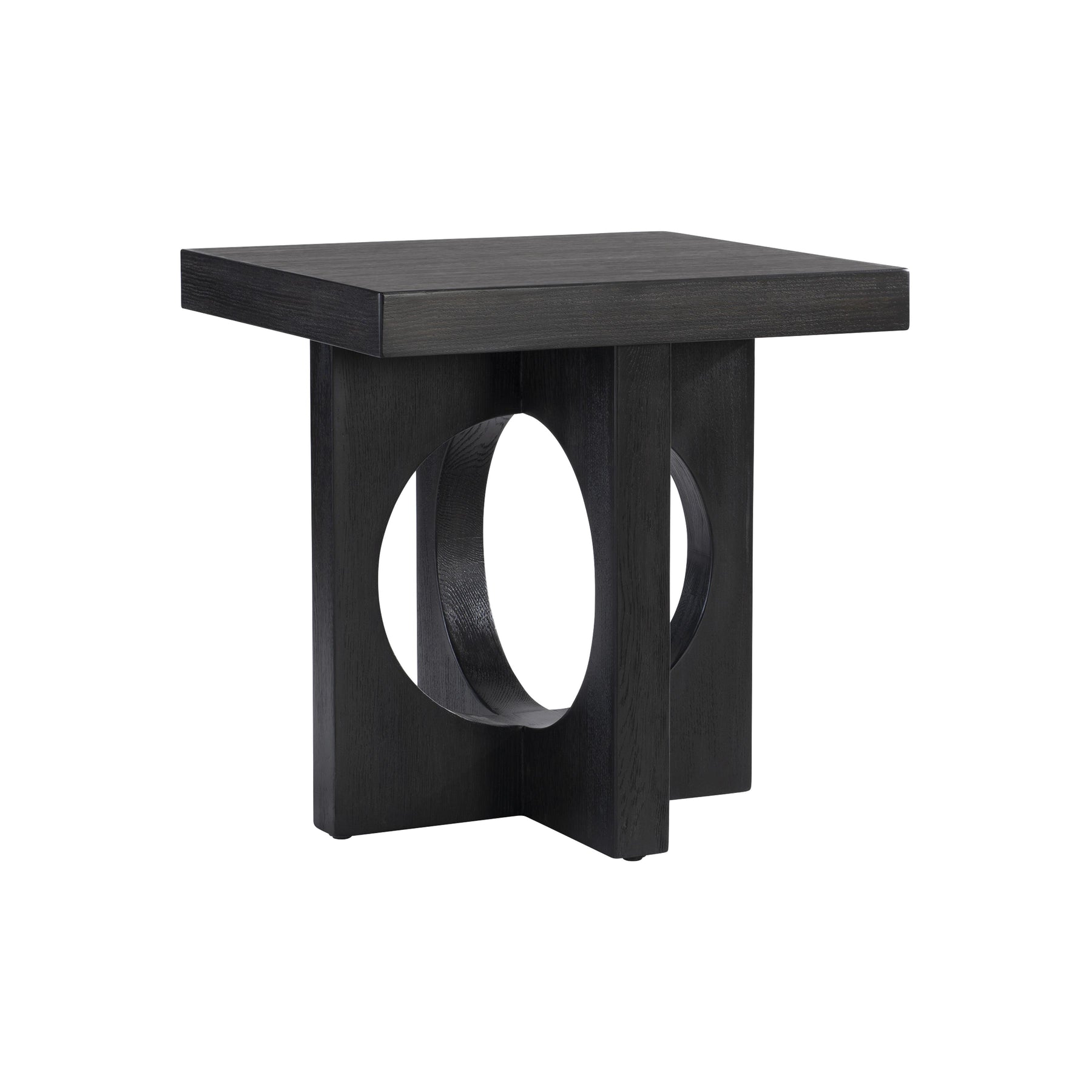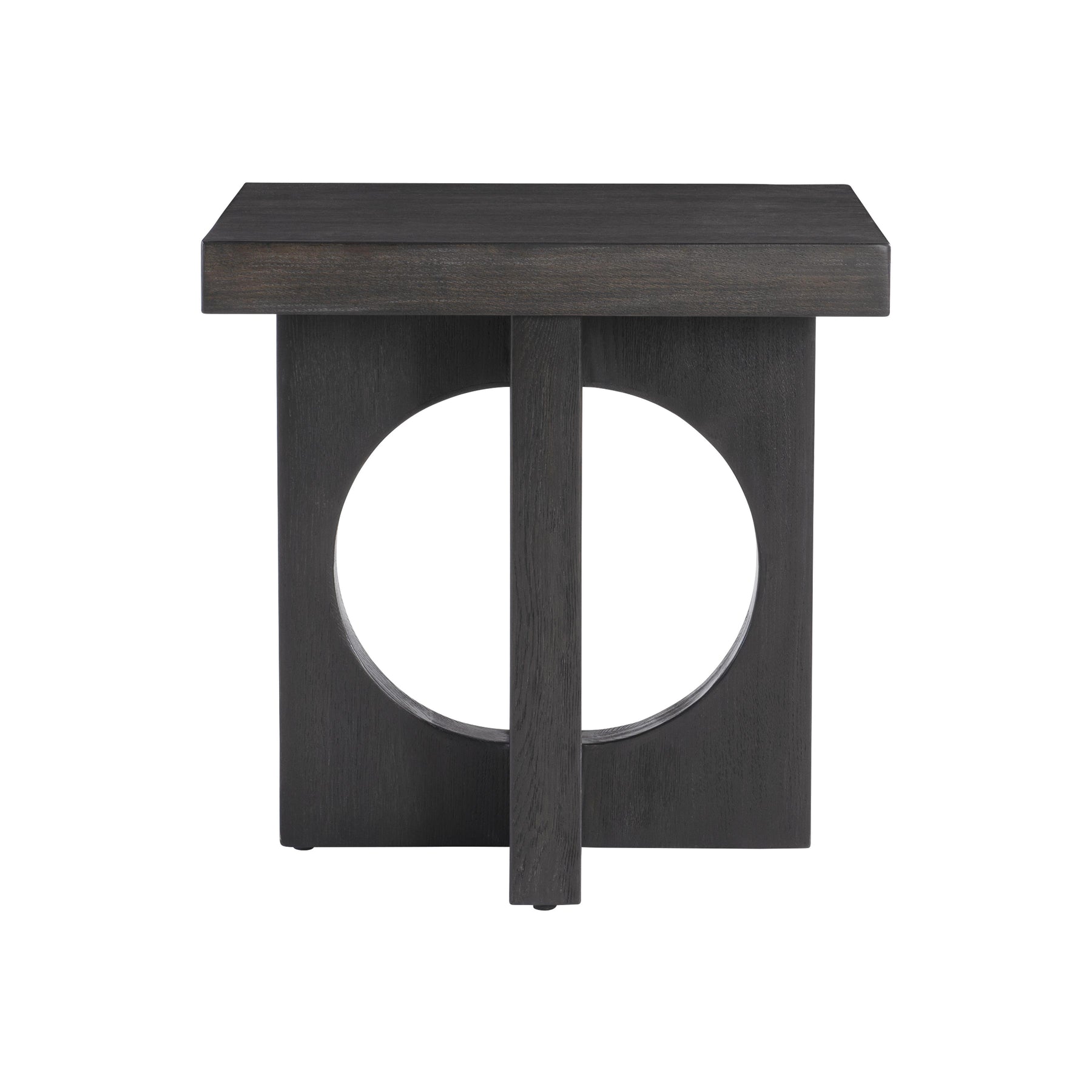 The Milton Side Table artfully combines circles and squares in a perfect balance. Its connected circular cutout base supports a sleek square top, all finished in rich Black Truffle. This modern geometric piece brings refined sophistication to any contemporary space.