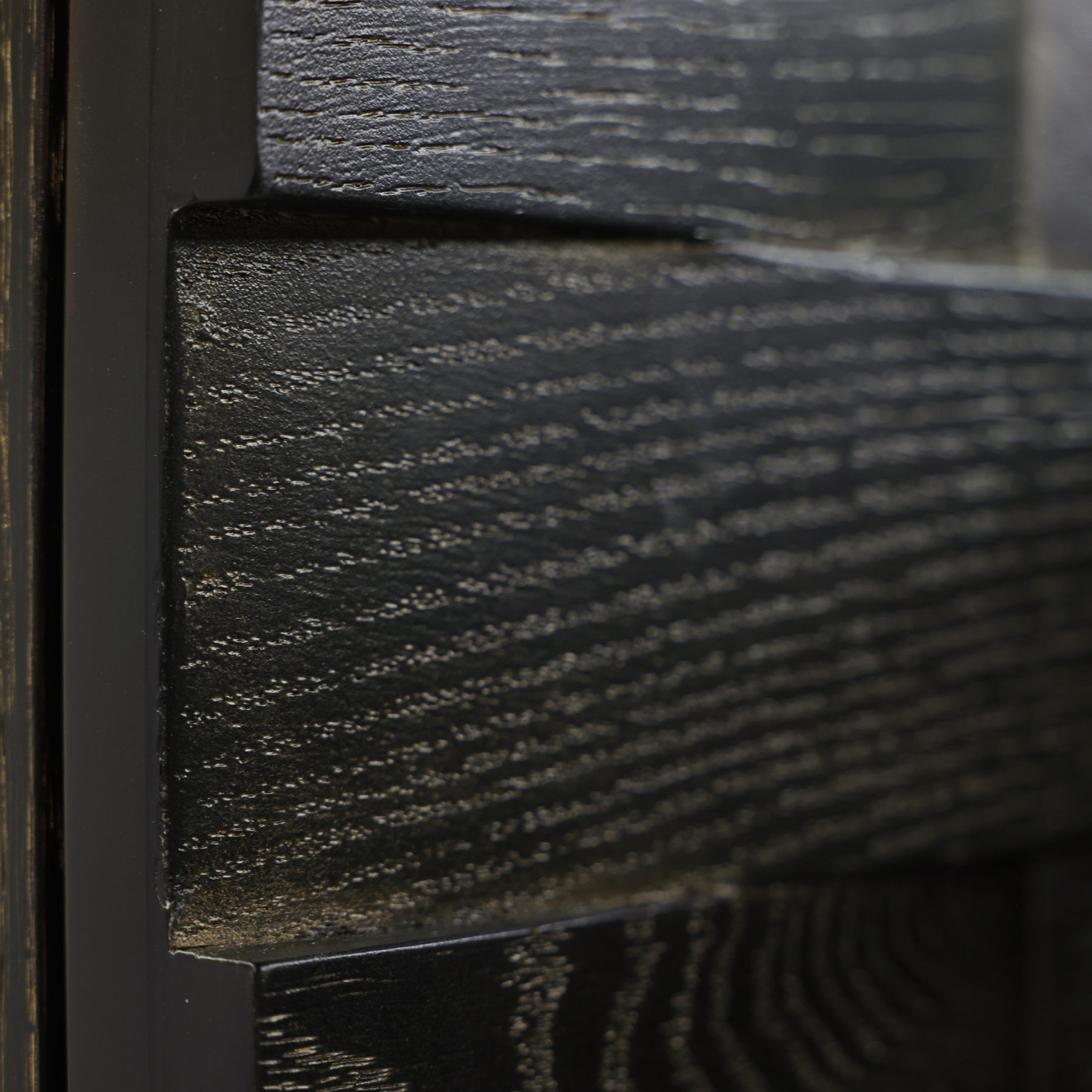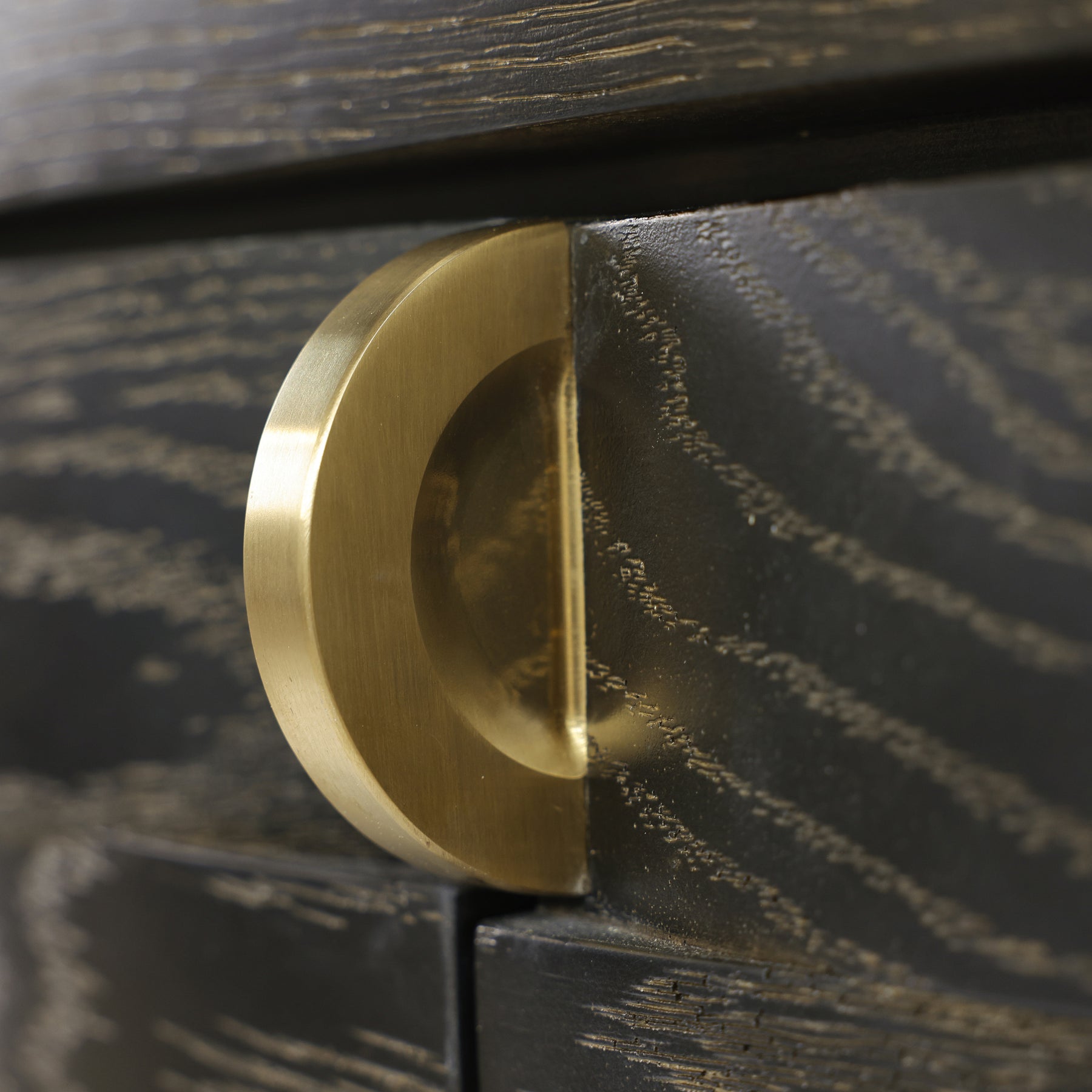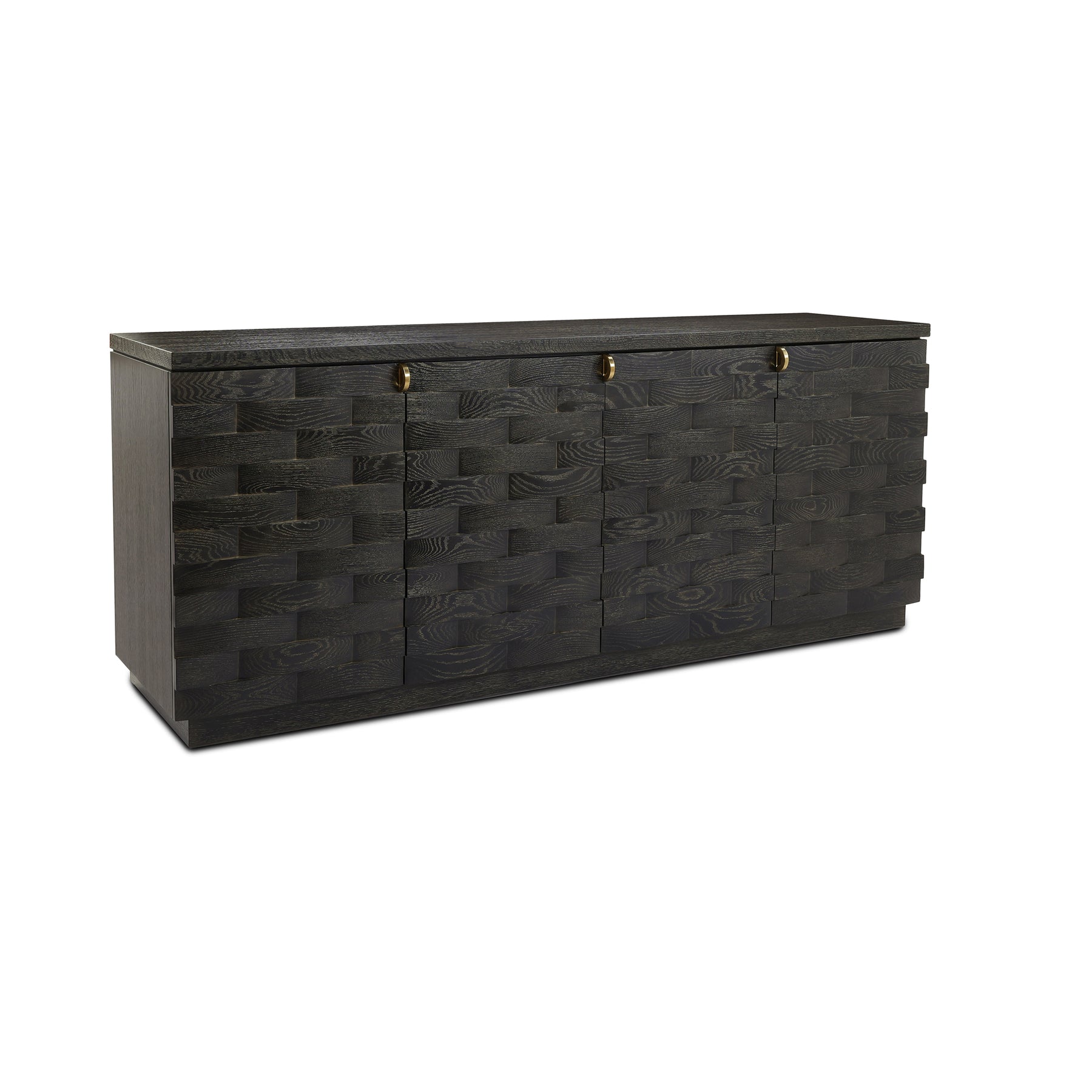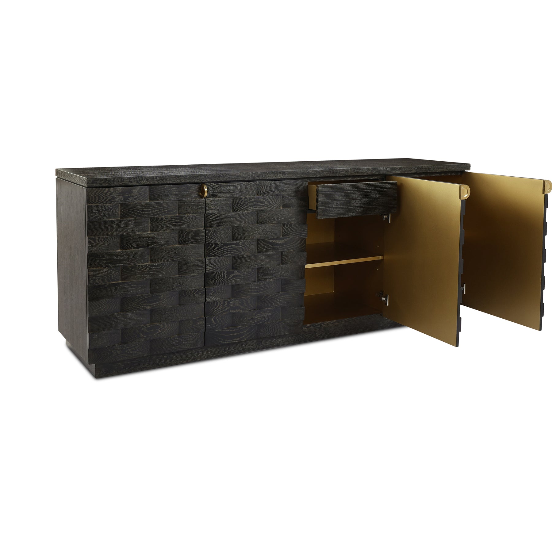 The Tessitore Four Door Credenza exemplifies refined craftsmanship with its solid oak construction and distinctive Gold Cerused Black finish. Geometric weave patterns grace the cabinet doors, creating visual depth and contemporary elegance. Brushed brass hardware provides understated sophistication, while the gold powder-coated interior adds a luxurious finishing touch. A statement piece that seamlessly blends modern design with timeless materials, perfect for curated living spaces.
